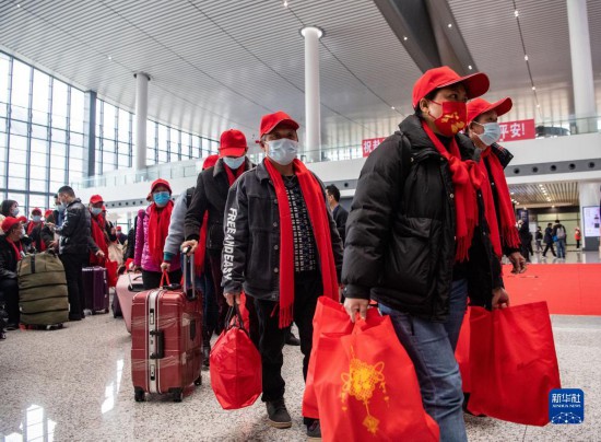 2月16日,返崗務(wù)工人員在重慶西站候車廳排隊(duì)前往檢票口,免費(fèi)乘坐復(fù)工專列前往廣東省返崗務(wù)工。新華社記者 唐奕 攝
