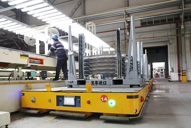 鋼板完成所有沖壓工序之后,都會(huì)經(jīng)過人工檢查,如果有問題會(huì)交到返修部門。配合檢測的還有平行光檢測室,檢測頻率是50件/次,檢測合格的產(chǎn)品會(huì)由AGV小車運(yùn)往倉庫。這種小車在其他車間同樣能夠見到,是個(gè)智能的自動(dòng)運(yùn)輸設(shè)備。