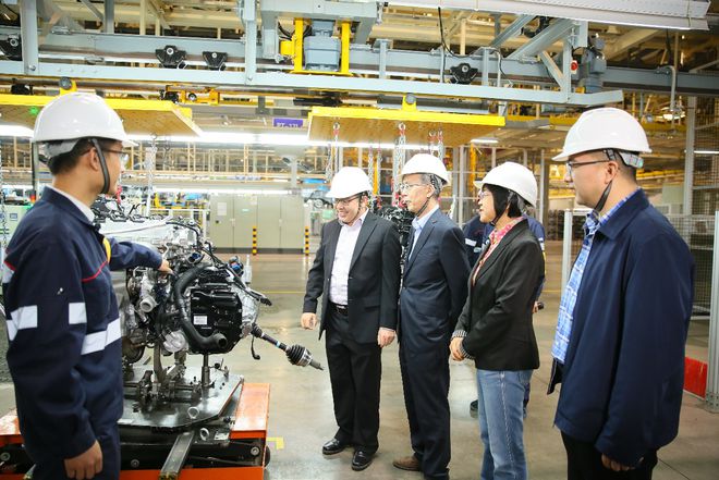 (動(dòng)力領(lǐng)域專(zhuān)家在合肥智慧工廠(chǎng)聆聽(tīng)長(cháng)安工程師講解工廠(chǎng)情況)